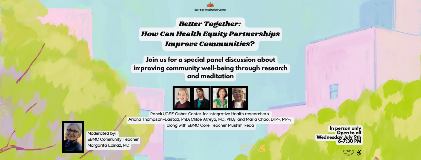 For the first time ever, please join us for a special panel discussion about community well-being with researchers representing the UCSF Osher Center for Integrative Health, Ariana Thompson-Lastad, PhD; Chloe Atreya, MD, PhD; and Maria Chao, DrPH, MPH; along with our very own EBMC Core Teacher Mushim Ikeda! We’re also grateful to have EBMC Community Teacher Margarita Loinaz, MD as our moderator for the evening.
